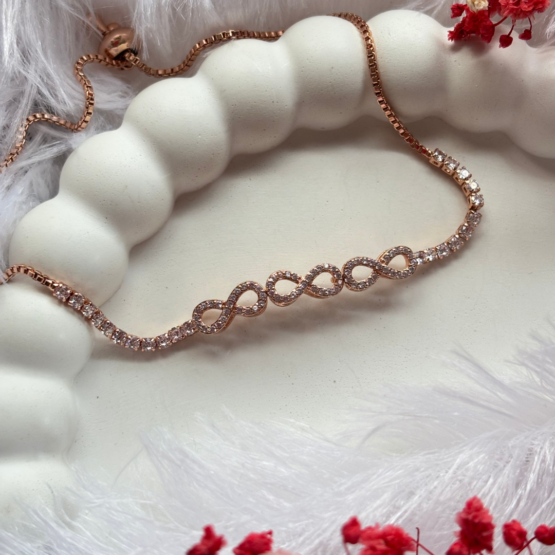 Celebrate infinite elegance with this dazzling Infinity love Bracelet. Designed with a stunning gold finish, the bracelet features a delicate chain adorned with shimmering diamonds infinity loops, symbolizing endless love and timeless beauty. Perfect for any occasion, this piece adds a subtle sparkle to your wrist, making it a must-have accessory for modern minimalists.