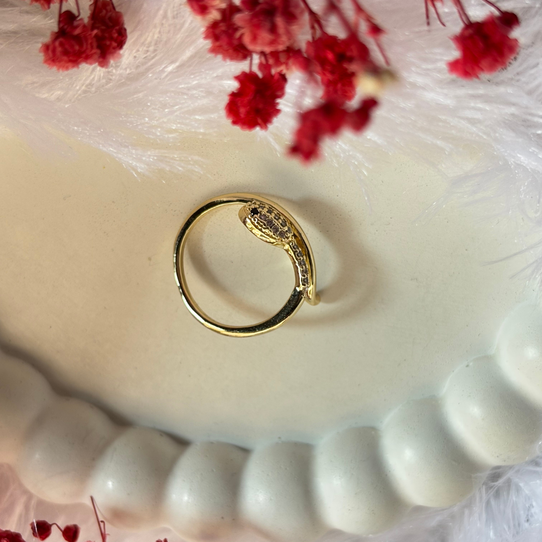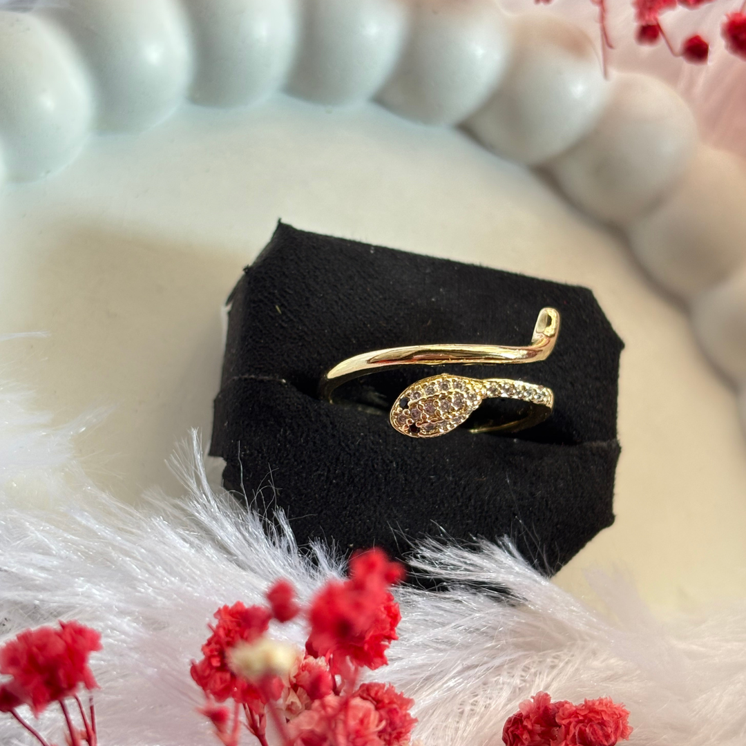 Unleash your inner edge with this bold and captivating snake-inspired ring. Designed with a sleek 18k gold-plated finish, this piece wraps elegantly around your finger, mimicking the graceful yet fierce form of a serpent. Adorned with glimmering diamonds on the snake's head, it adds just the right amount of sparkle to your look. Perfect for anyone who loves a statement piece. Embrace your wild side!"