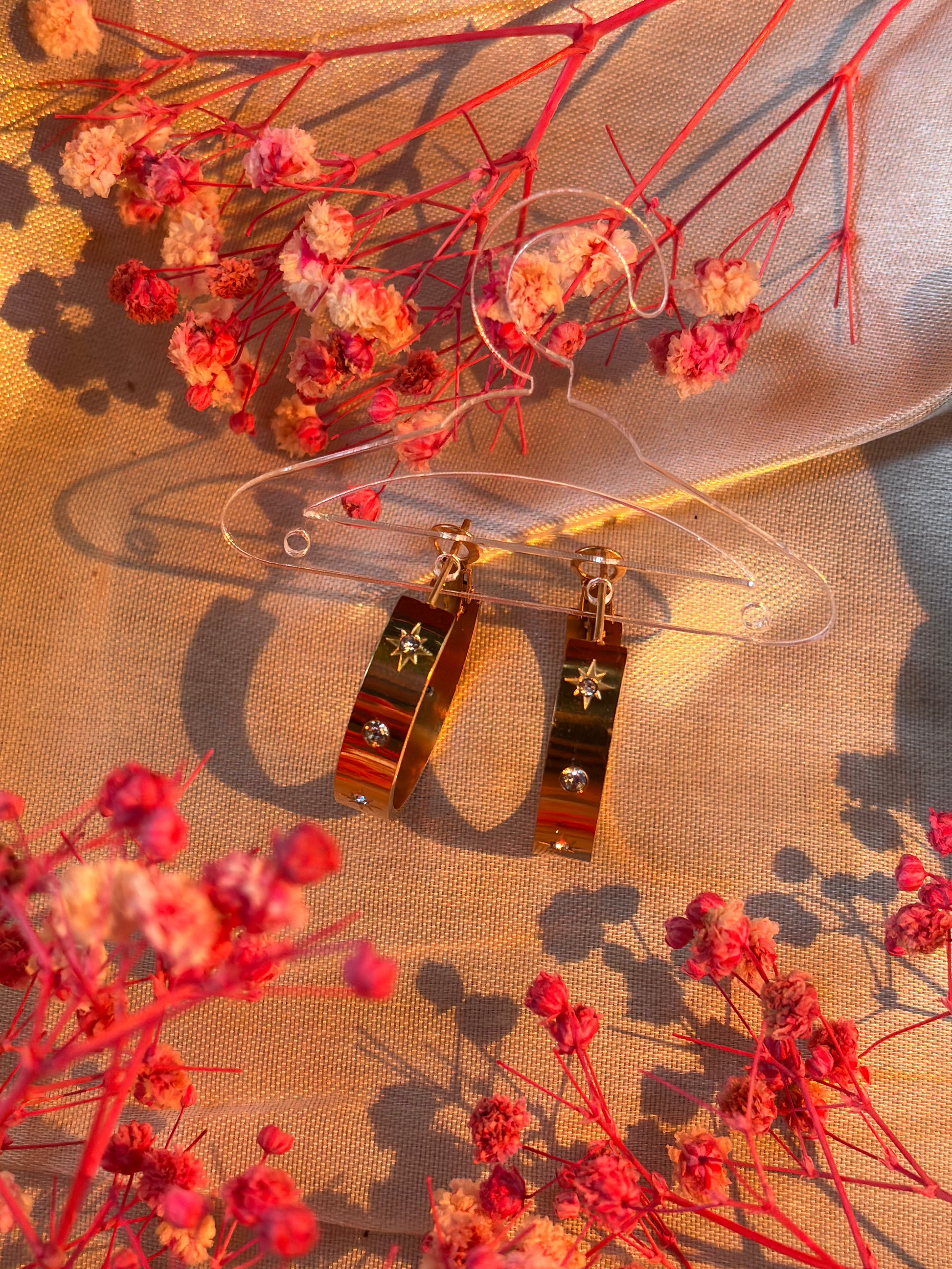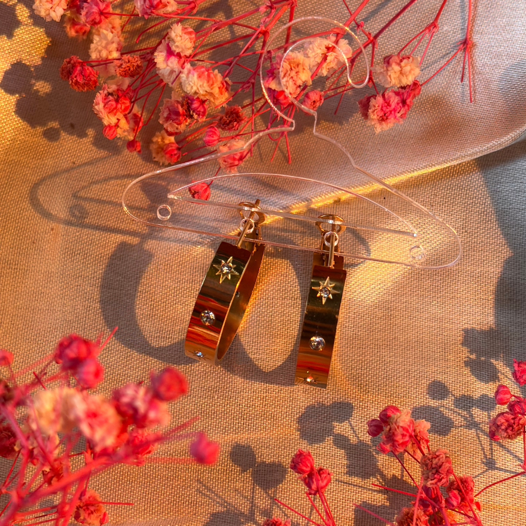 Introducing our Starburst Shine Earrings, a pair of elegant and sophisticated hoops designed to capture the brilliance of the night sky. These exquisite earrings feature a sleek gold band adorned with delicately engraved star motifs, each set with a sparkling crystal that catches the light beautifully. The hoops are crafted with a smooth, polished finish, ensuring they shine with every movement. Perfect for adding a touch of celestial glamour to any outfit, these earrings are versatile enough for both everyday wear and special occasions.